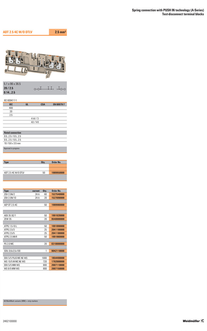 »óǰ¸í : ADT 2.5 4C W/O DTLV  Á¦Á¶¿ø:  Weidmuller ¹ÙÀ̵å¹Ä·¯